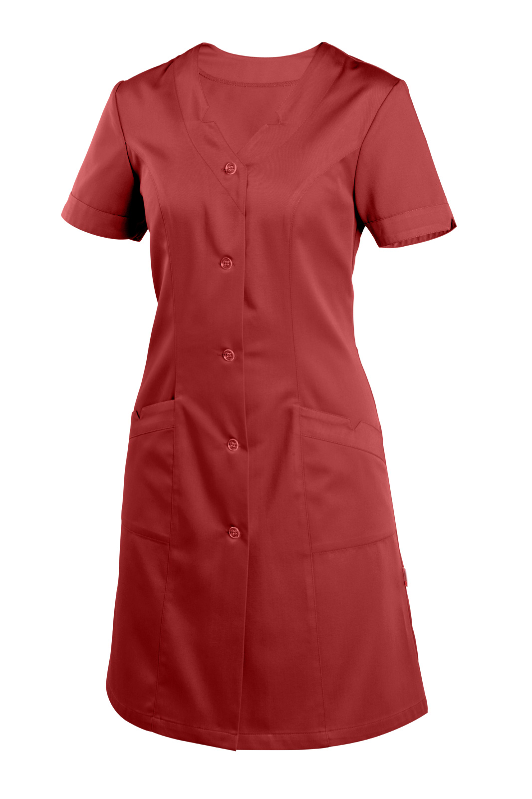 Princesového střihu, celopropínací na knoflíky a krátký rukáv s lemováním. Výstřih do V a na předním díle dvě našité kapsy. Lem rukávu, kapes a výstřih je ozdoben prostřihem do tvaru V.
