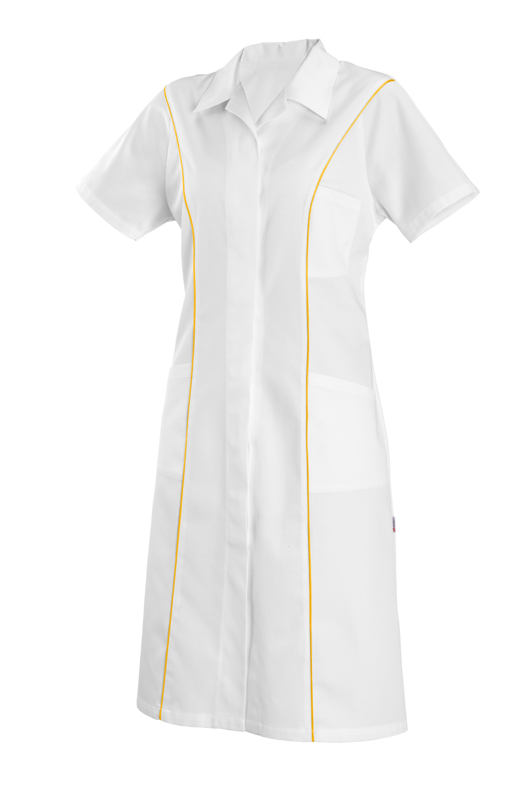 Princesového střihu, zapínání kryté na knoflíky a krátký rukáv. Výstřih do rozhalenky, na předním díle princes s všitou barevnou dutinkou a tři našité kapsy.