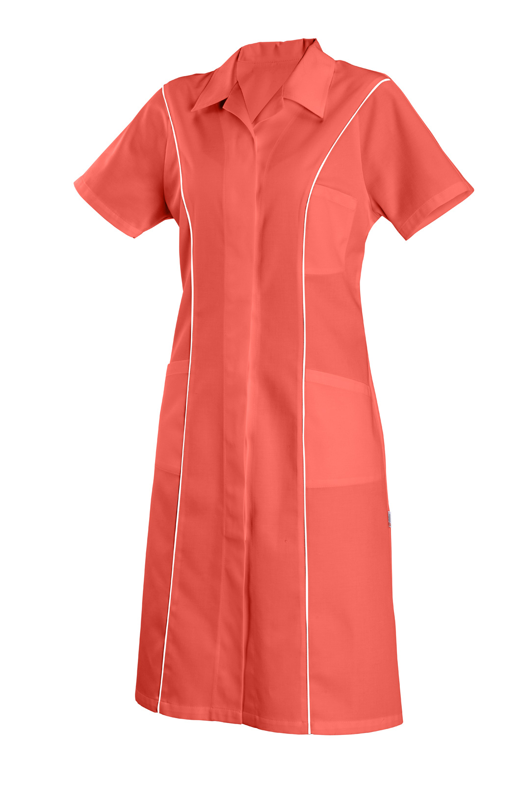 Princesového střihu, zapínání kryté na knoflíky a krátký rukáv. Výstřih do rozhalenky, na předním díle princes s všitou bílou dutinkou a tři našité kapsy.