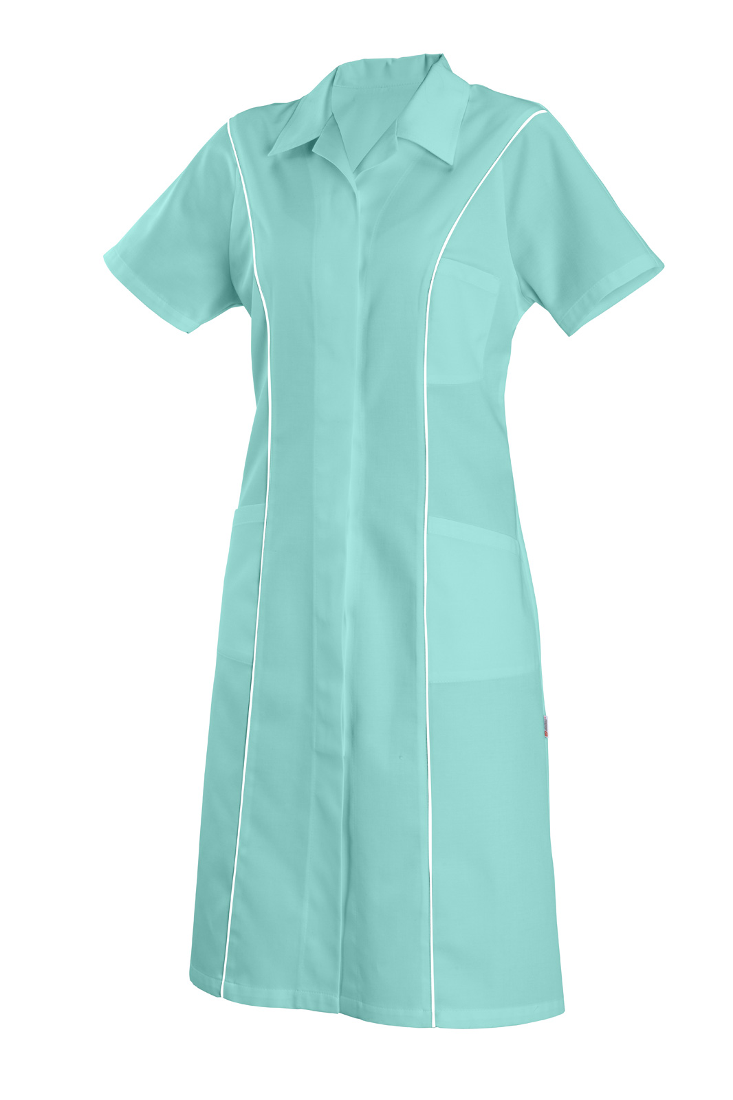 Princesového střihu, zapínání kryté na knoflíky a krátký rukáv. Výstřih do rozhalenky, na předním díle princes s všitou bílou dutinkou a tři našité kapsy.