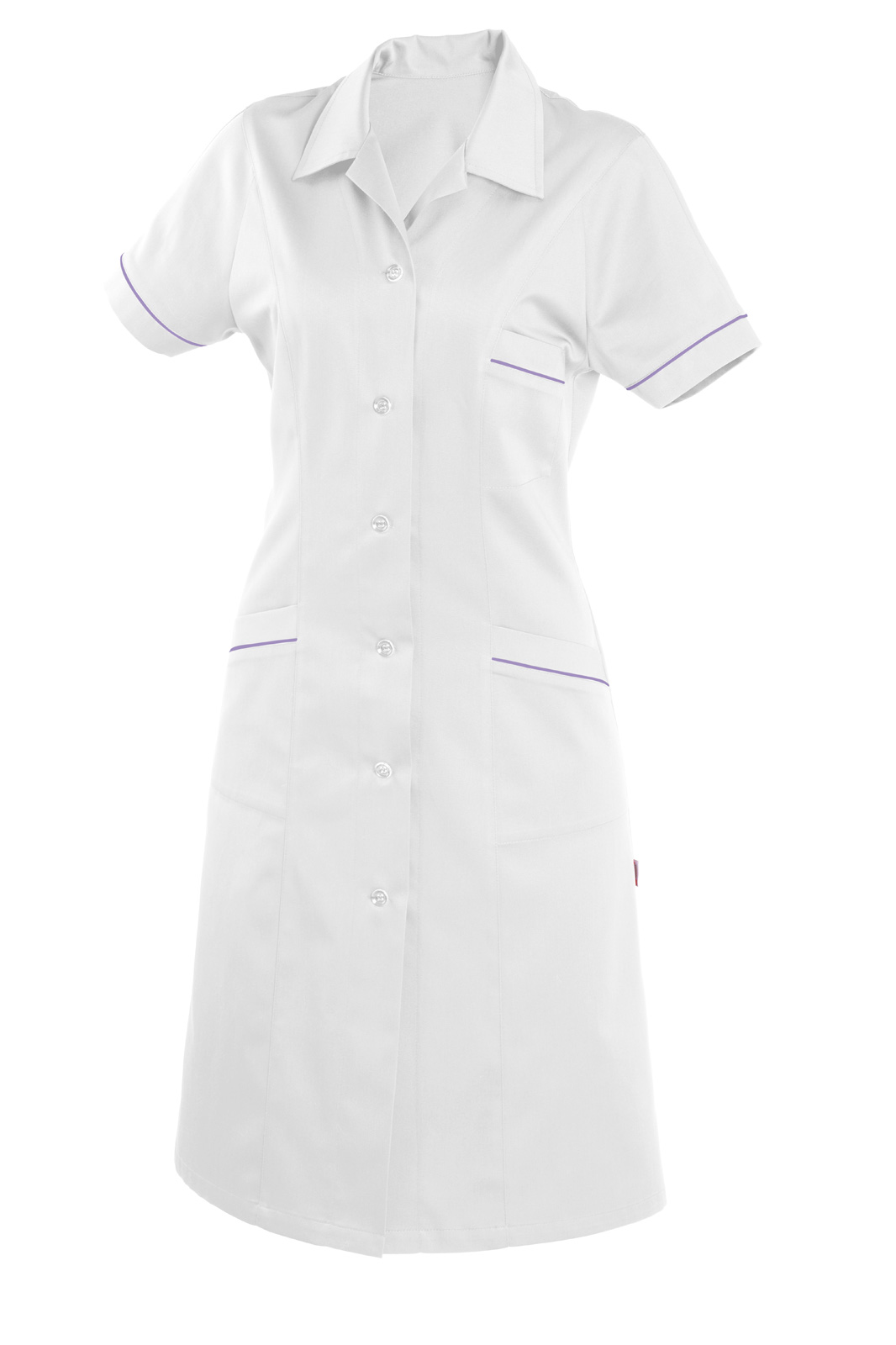Princesového střihu, celopropínací na knoflíky a krátkým rukávem. Výstřih do rozhalenky, tři našité kapsy a rukávy jsou lemovány barevnou dutinkou.