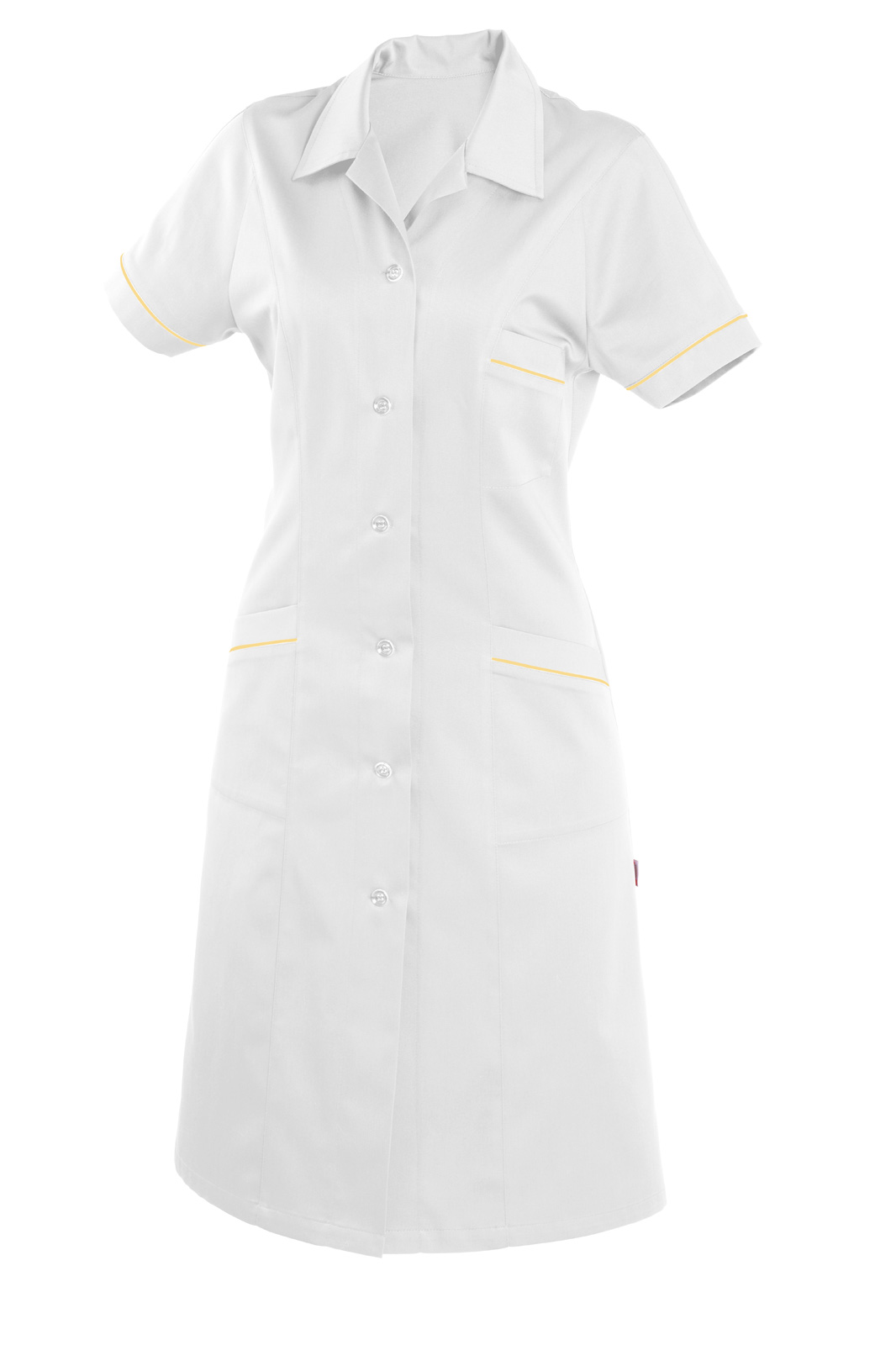 Princesového střihu, celopropínací na knoflíky a krátkým rukávem. Výstřih do rozhalenky, tři našité kapsy a rukávy jsou lemovány barevnou dutinkou.
